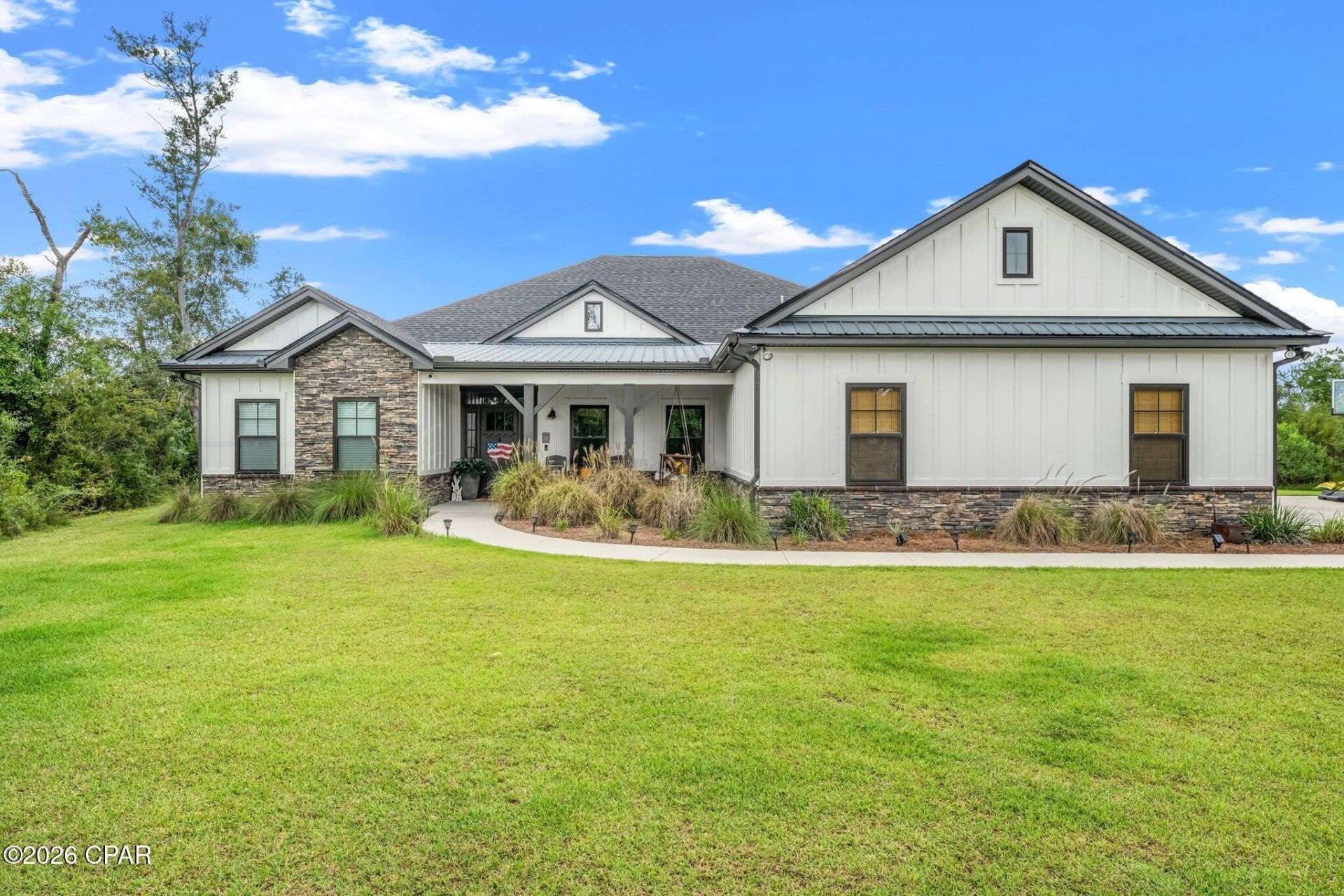 Welcome to this beautifully crafted custom home offering 2,912 square feet of thoughtfully designed living space on a private 1. 74-acre lot in a desirable gated community. Built in 2018, this 4-bedroom, 3-bath residence combines modern comfort with timeless style, all just a short drive from Panama City Beach. Step inside to an open-concept layout featuring 10-foot ceilings, abundant natural light, and high-end finishes throughout. The heart of the home is the spacious kitchen with an oversized 10-foot island, seamlessly flowing into the living and dining areas--perfect for both everyday living and entertaining. A cozy brick fireplace anchors the living room, while LVP flooring runs throughout the main areas for durability and style. The oversized primary suite offers a private retreat with direct access to the screened-in back porch, creating a seamless indoor-outdoor living experience. The en-suite bath features a walk-in shower with bench and a 6-foot soaking tub, while secondary bathrooms include upgraded 5-foot soaking tubs. Additional spaces include a dedicated office and a fully equipped movie room, providing flexibility for work, relaxation, and entertainment. Enjoy quiet mornings on the covered front porch, complete with a charming porch swing, or unwind in the spacious 18x10 screened-in back porch overlooking your private, wooded backyard. The outdoor space is truly one of a kind, featuring a custom tree fort and obstacle course tucked into the woods--perfect for adventure and creating lasting memories. The home's exterior showcases a beautiful blend of stone and board-and-batten siding, enhancing its curb appeal. Located within a gated community offering a pool, clubhouse, playground, and private dock access to Deer Point Lake, residents enjoy both privacy and convenience. This property also features an assumable VA mortgage at an exceptionally low 2. 25% interest rate--an incredible opportunity for qualified buyers. Don't miss your chance to own a unique property that offers space, privacy, and lifestyle all in one.